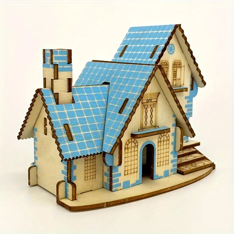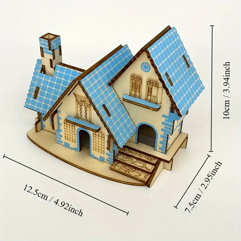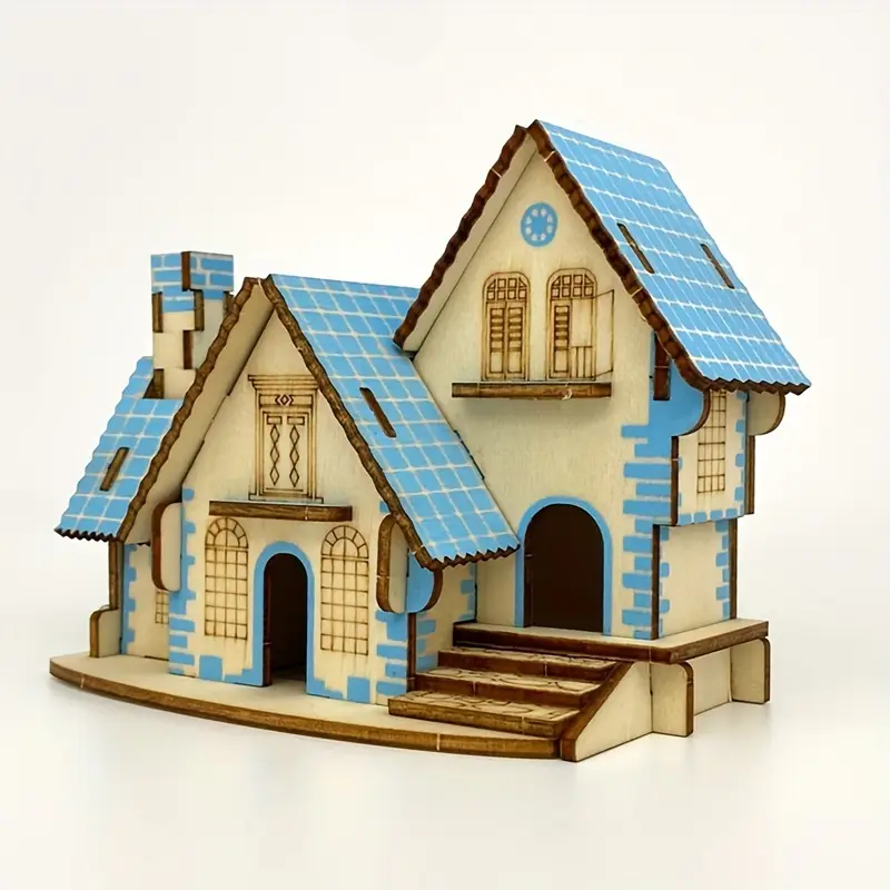 أحجية خشبية ثلاثية الأبعاد باللون الأزرق – مجموعة نموذج معماري لكوخ لديكور غرفة النوم والمعيشة