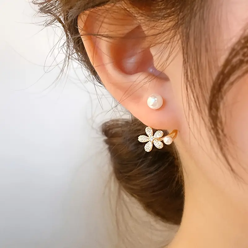 أقراط ذهبية رائعة مزينة بأحجار الزركونيا اللامعة واللؤلؤ الصناعي بأسلوب أنيق وبسيط مجوهرات من سبائك معدنية