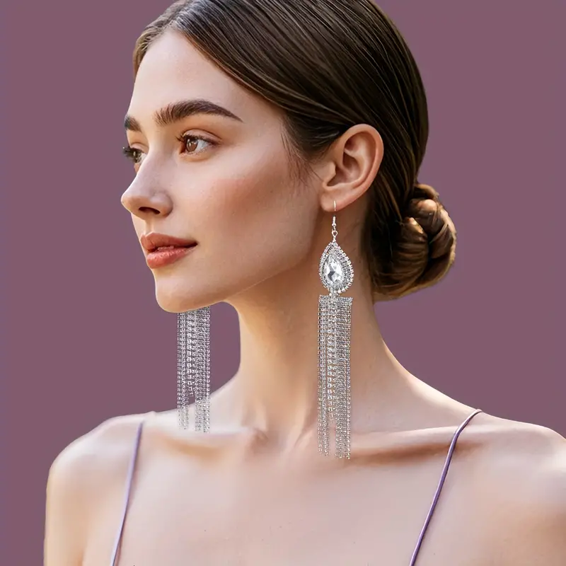 أقراط متدلية ومتدلية أنيقة بتصميم فرينج طويل متألق بدون طلاء، موزاييك الراينستون، إكسسوار أنيق للأعراس والحفلات