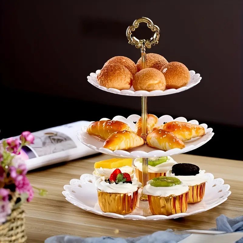 حامل كيك مزخرف من 3 طبقات للحلويات والكب كيك – صينية تقديم بلاستيكية على طراز جلام لحفلات الشاي والاحتفالات – برج عرض أنيق للأناقة الاحتفالية ، لا حاجة للكهرباء