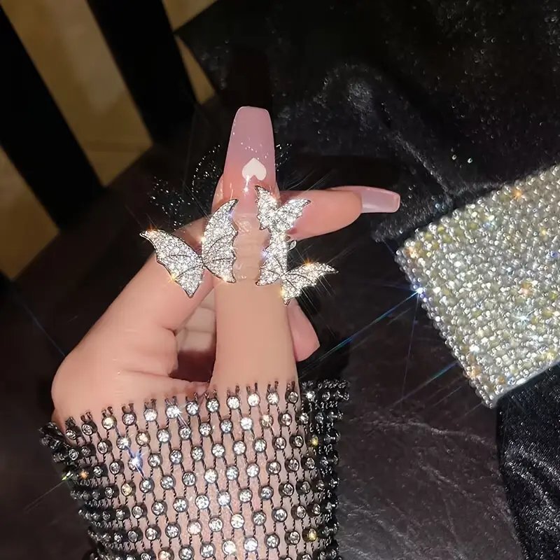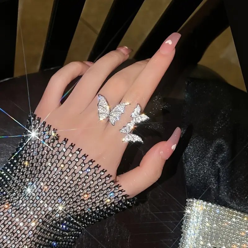 خاتم فراشة أنيق بتصميم نمط قديم، مصنوع من سبيكة الزنك، خاتم مفتوح وقابل للتعديل للإصبع، مزين بحجر الراين مقاومة للصدا