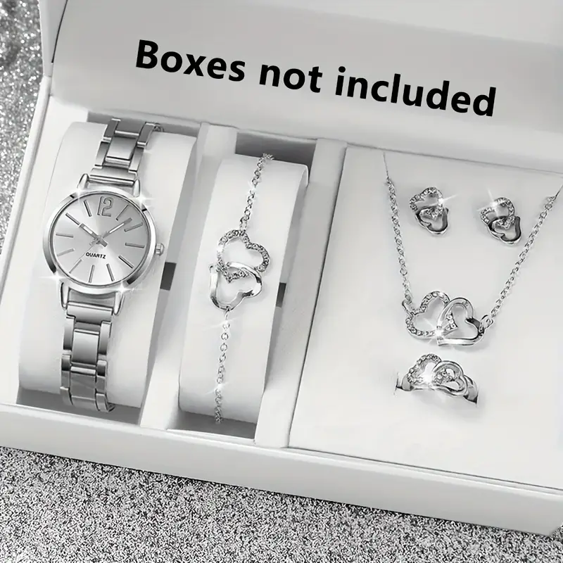 ساعة نسائية كوارتز عصرية من 6 قطع بعلبة سبيكة دائرية – مجموعة مجوهرات على شكل قلب أنيقة، طقم مينا بسيط وأنيق، سوار سبيكة غير، مثالي للعمل والمناسبات الخاصة