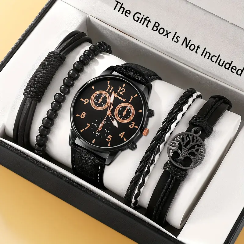 طقم ساعة كوارتز وأساور رجالي من 5 قطع – تصميم دائري رائع مع ميزة التاريخ، علبة من سبيكة الزنك، حزام من الجلد الصناعي