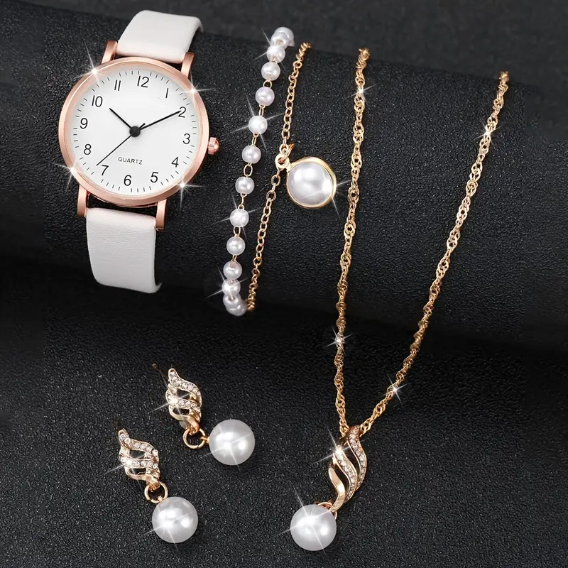 طقم ساعة كوارتز ومجوهرات نسائية أنيقة من 5 قطع