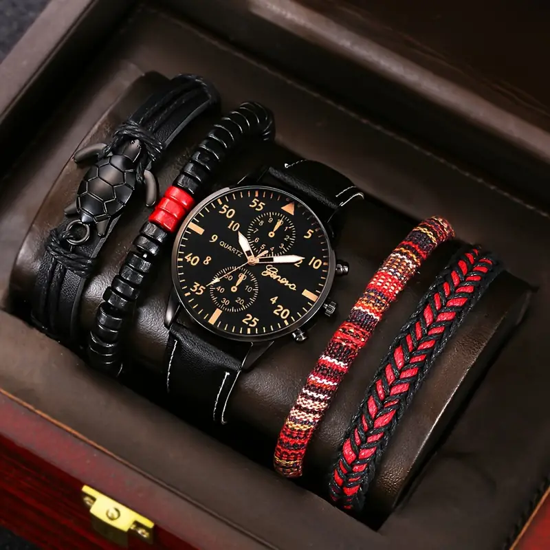 طقم ساعة وأساور رجالي من 5 قطع – أسلوب عمل كاجوال مع حركة كوارتز، حزام جلد صناعي، وأساور مضفرة بخرز مع تعليقة سلحفاة