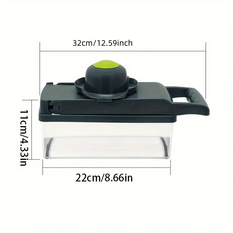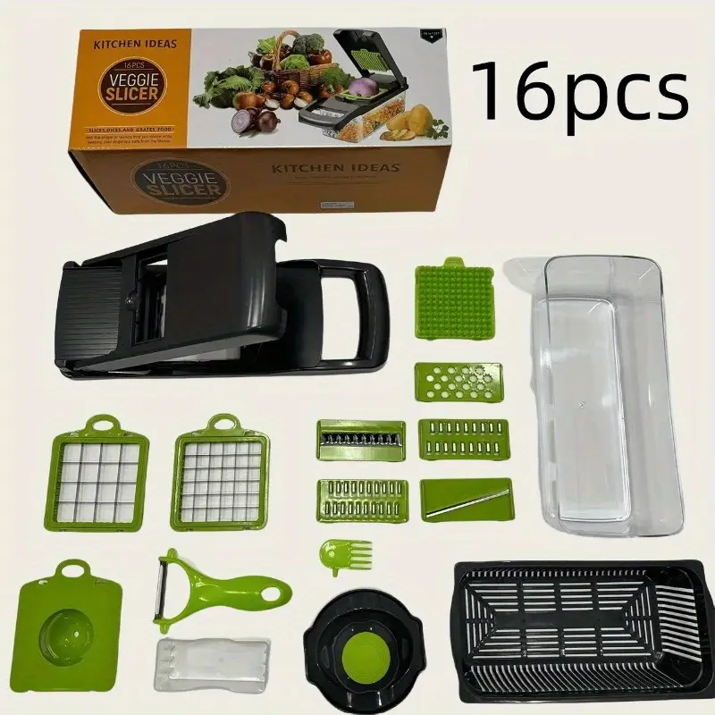 طقم قواطع الخضار من الفولاذ المقاوم للصدأ 16 قطعة – آلة تقطيع الطعام اليدوية مع شفرات قابلة للتبديل، قاطع فواكه، مطحنة بصل، قاطع بطاطس – أدوات مطبخ متعددة الاستخدامات للاستخدام المنزلي والمطاعم