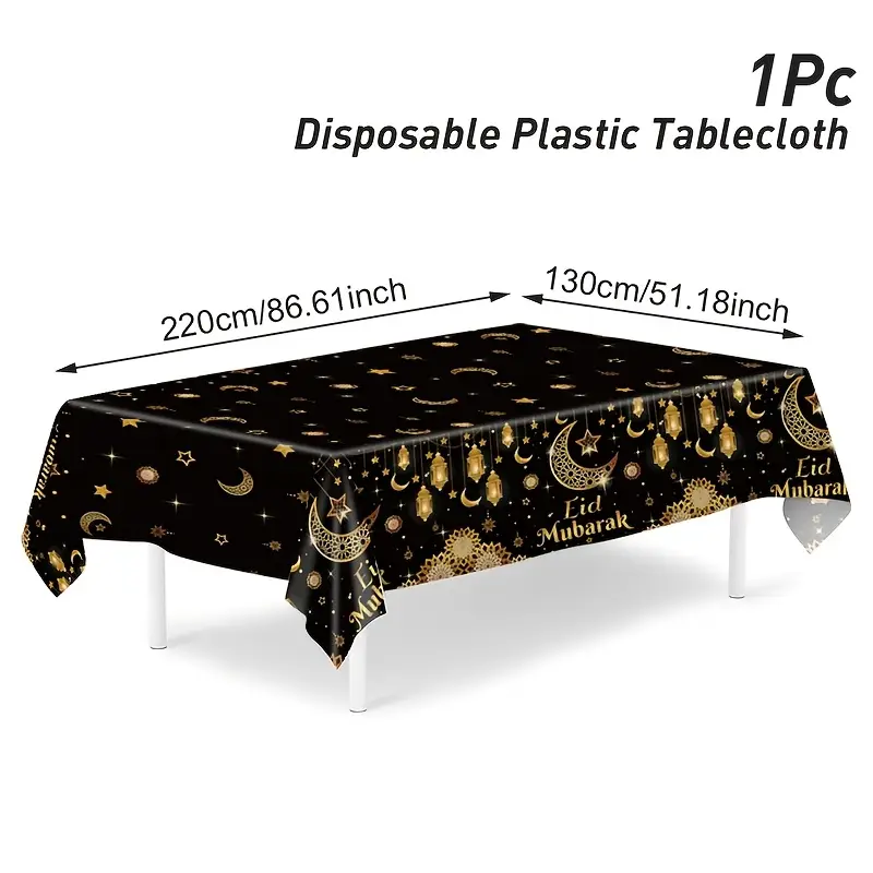 غطاء طاولة بمناسبة عيد مبارك، بتصميم الفوانيس والنجوم والهلال باللونين الأسود والذهبي، مصنوع من البلاستيك، مقاس 130×220 سم
