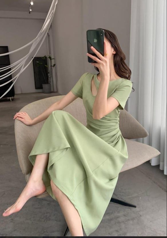 فستان حريمي 2023 صيفي جديد غير رسمي قصة التدريجي تصميم فرنسي نحيف رقبة مستديرة كم قصير تصميم خصر نمط هيبين فستان طويل نسائي