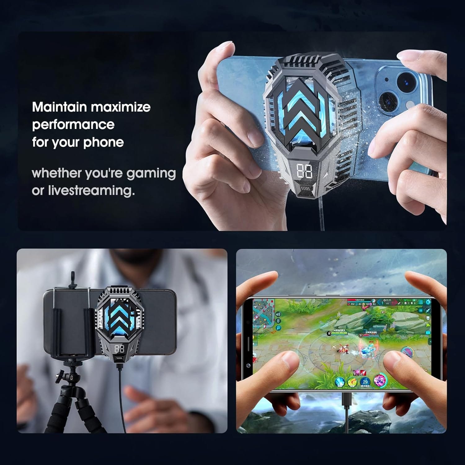 - 【معدل ضربات القلب】يعمل مبرد الهاتف عند 30 ديسيبل أو أقل، يضمن مبرد الهاتف بيئة هادئة للألعاب والبث والمحادثات. استمتع بتركيز مستمر وترفيه غامر دون تشتيت ضوضاء المروحة.