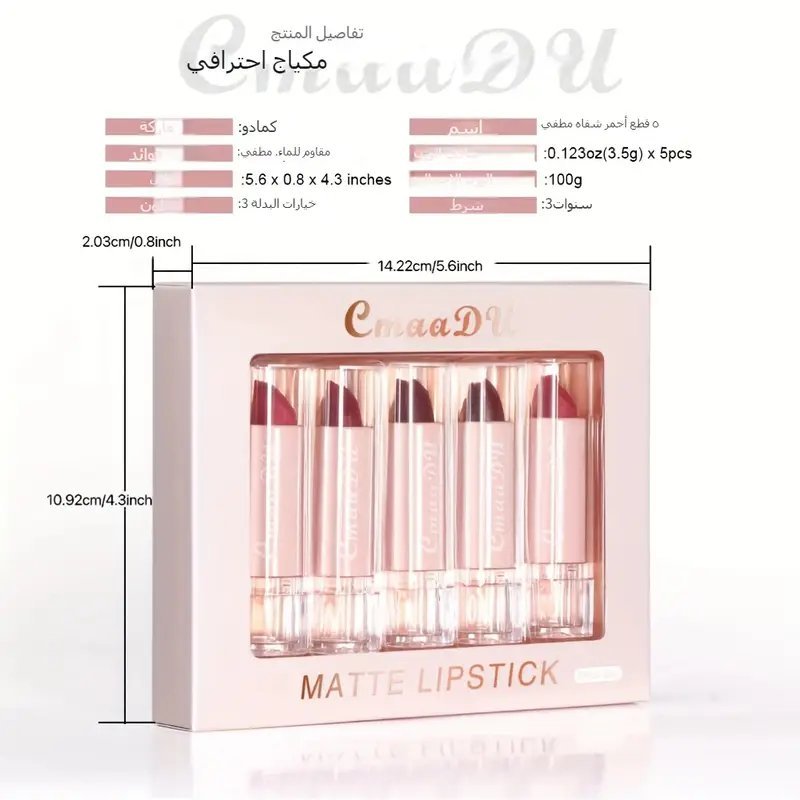مجموعة أحمر شفاه 5 قطع، أحمر شفاه مخملي غير لامع مقاوم للماء، مجموعة محدد شفاه وأحمر شفاه، يدوم طوال اليوم، بني كستنائي، بني غامق، أحمر غير لامع، يدوم 24 ساعة