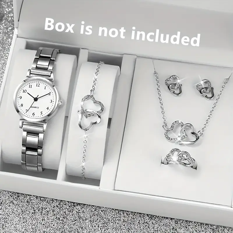 مجموعة أنيقة من 6 قطع للساعات الكوارتز النسائية ومجوهرات على شكل قلب – علبة سبيكة أنيقة، تصميم مينا بسيط