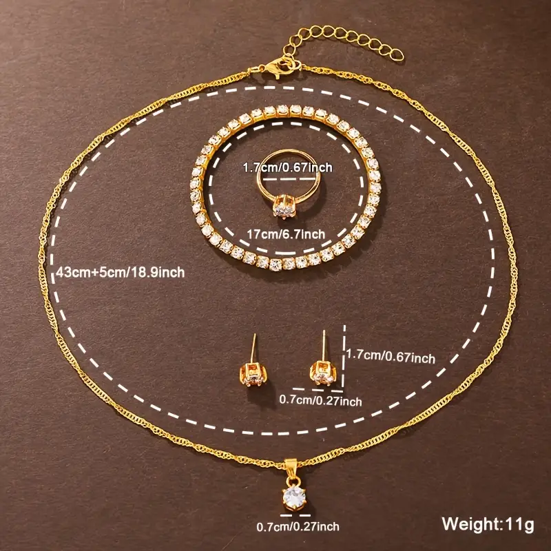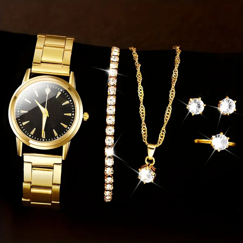 مجموعة أنيقة من 6 قطع للمجوهرات النسائية والساعة الكوارتز – قلادة وأقراط وخاتم وسوار وسرج من الراين الذهبي