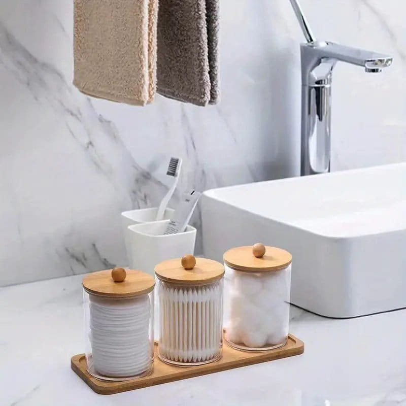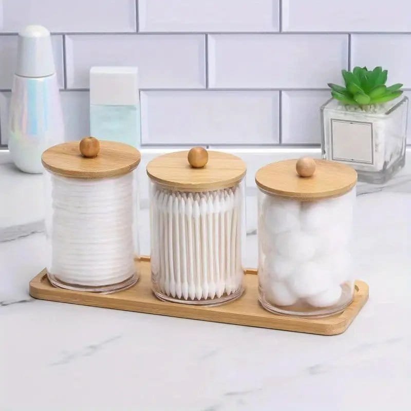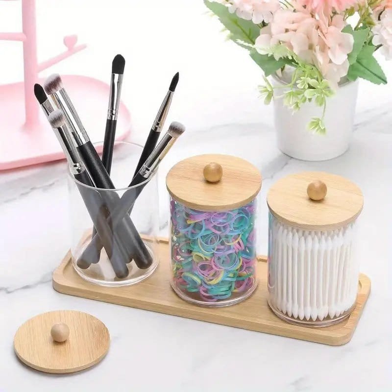 مجموعة برطمانات تخزين أكريليك بغطاء من الخيزران الأنيق – حاويات دائرية شفافة للمستحضرات التجميلية والأغراض الصغيرة، ألوان متنوعة، 3 خزانات تخزينية +1 صينية