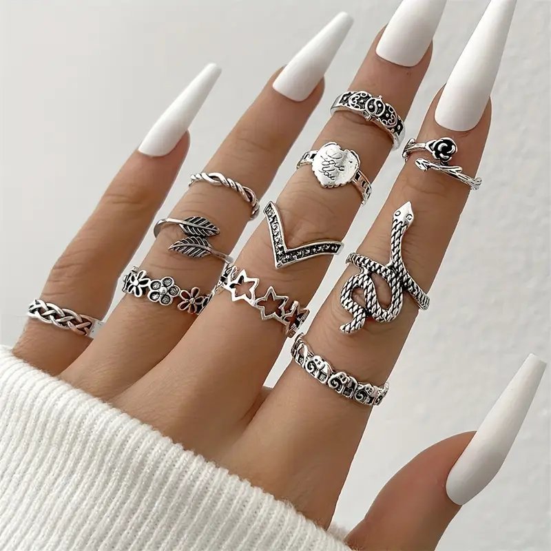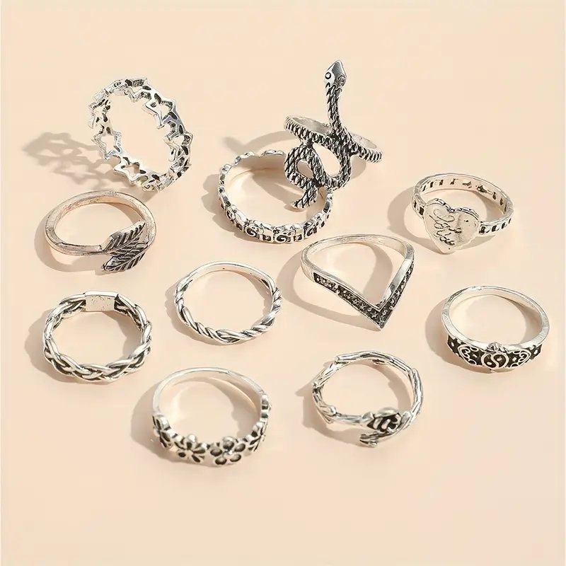 مجموعة خواتم سبيكة نمط قديمة وأنيقة من 11 قطعة – تصاميم نجمة، ثعبان، زهرة مقاومة للصدا