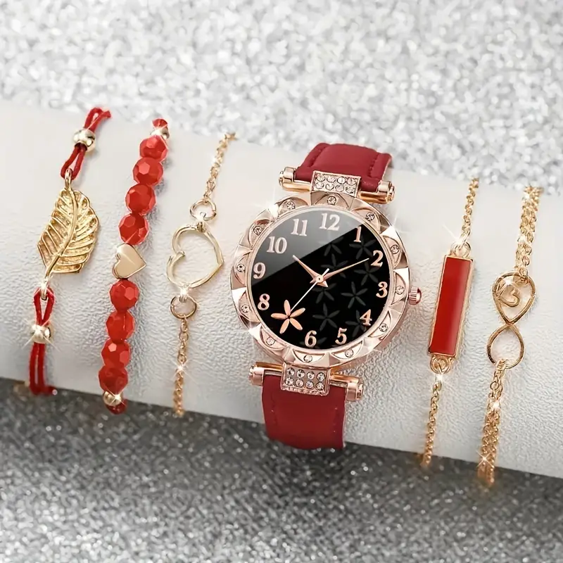مجموعة ساعات كوارتز أنيقة مكونة من 6 قطع للنساء مع لمسات الراين، حزام جلد صناعي وأساور مطابقة