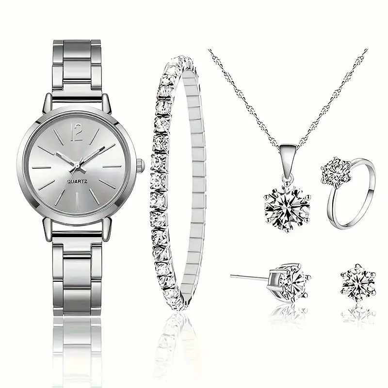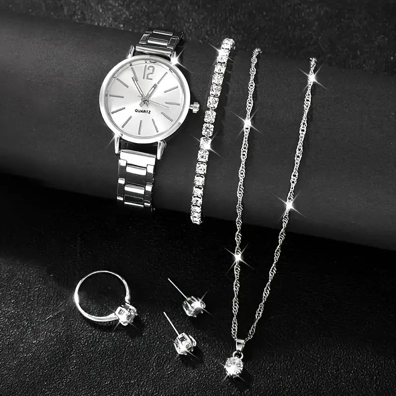 مجموعة ساعة كوارتز أنيقة للنساء ومجوهرات – 6 قطع ساعة يد أنالوج أنيقة من الفولاذ المقاوم للصدأ مع لمسات الراينستون،
