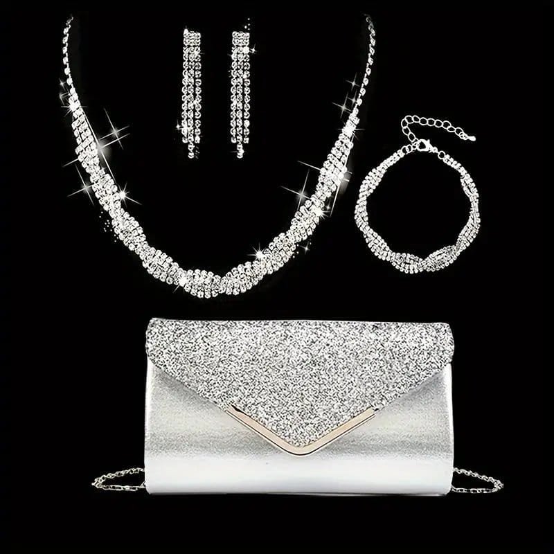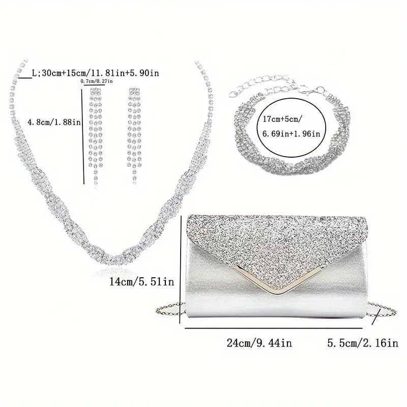 مجموعة شنطة كبيرة الحجم مزينة بالراين للنساء – حقيبة مساء مع عقد متناسق وأقراط وسوار مقاوم للصدا – لون صلب، إغلاق مغناطيسي، بطانة – إكسسوار حقيبة حفلة أنيقة . هدايا للأصدقاء. اعراس .