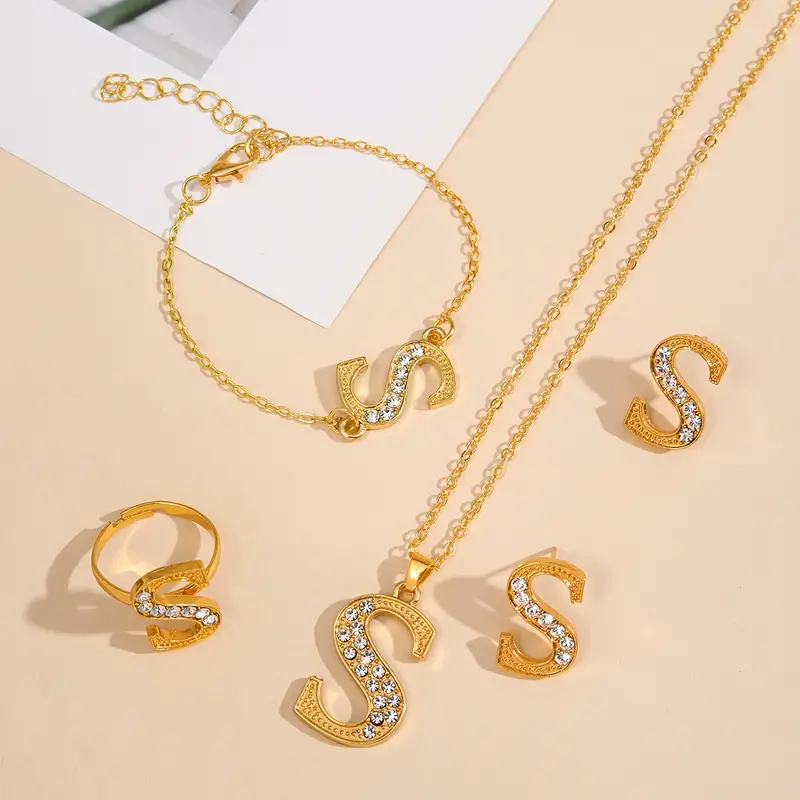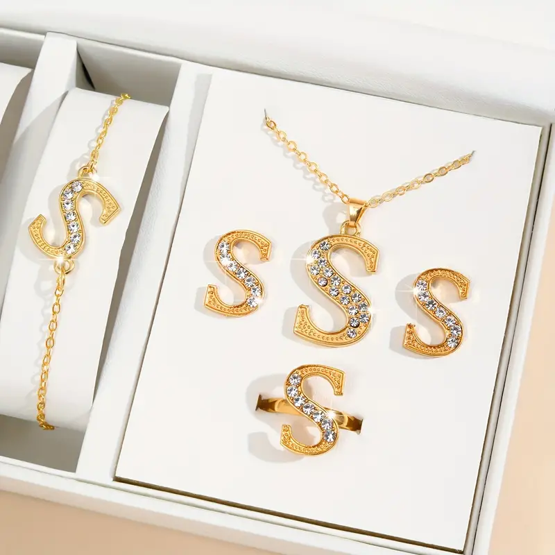 مجموعة مجوهرات فاخرة أنيقة مكونة من 5 قطع مع تصميم حرف S، مرصعة بالراين الاصطناعي،