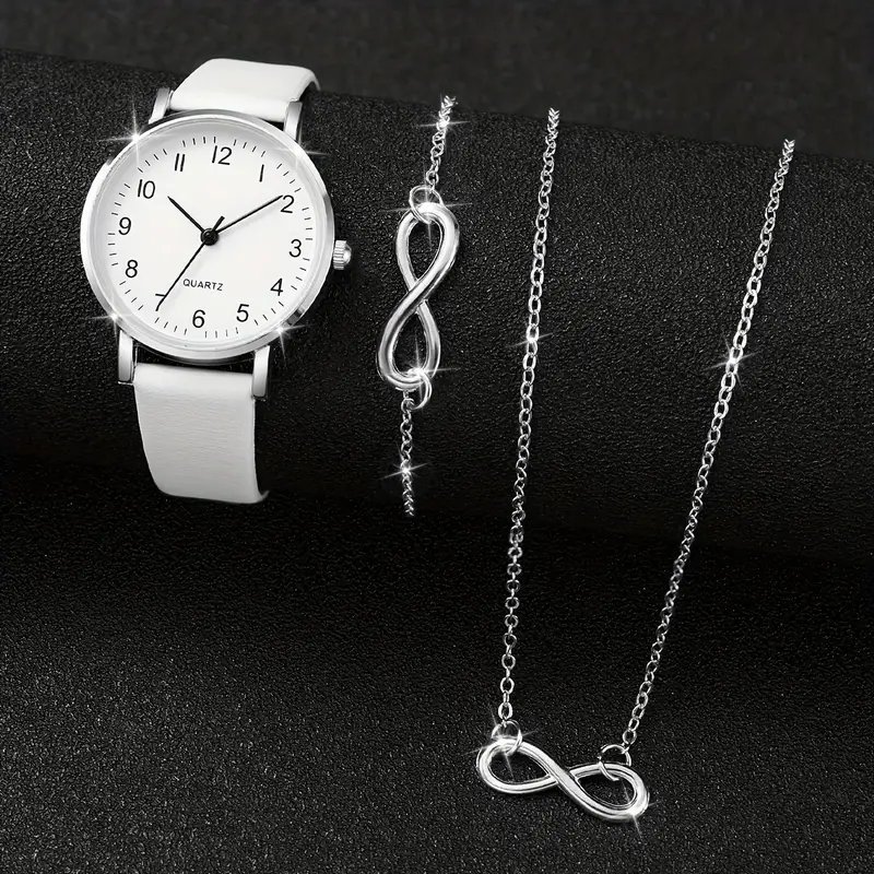 مجموعة من 3 قطع ساعة يد كوارتز أنيقة بتصميم بسيط مع مجوهرات، مجموعة تتضمن ساعة يد مع حزام من الجلد الصناعي