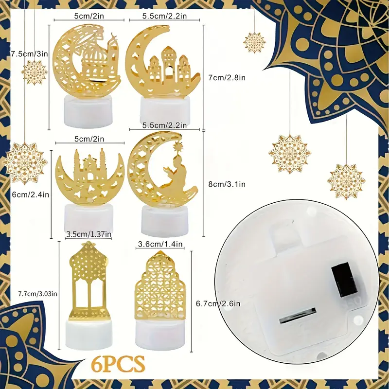مجموعة 6 أضواء طاولة رمضان LED – زينة وحيوية، موفرة للطاقة، تعمل بالبطارية