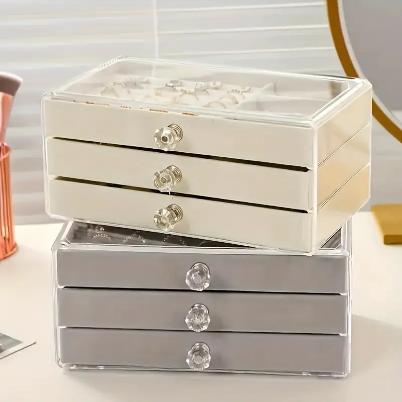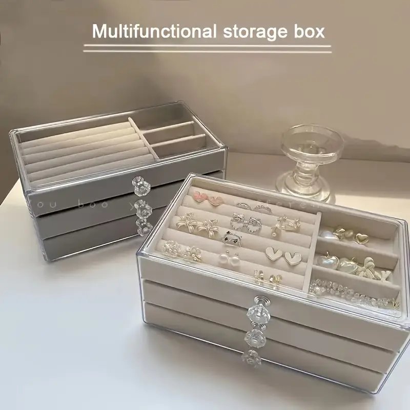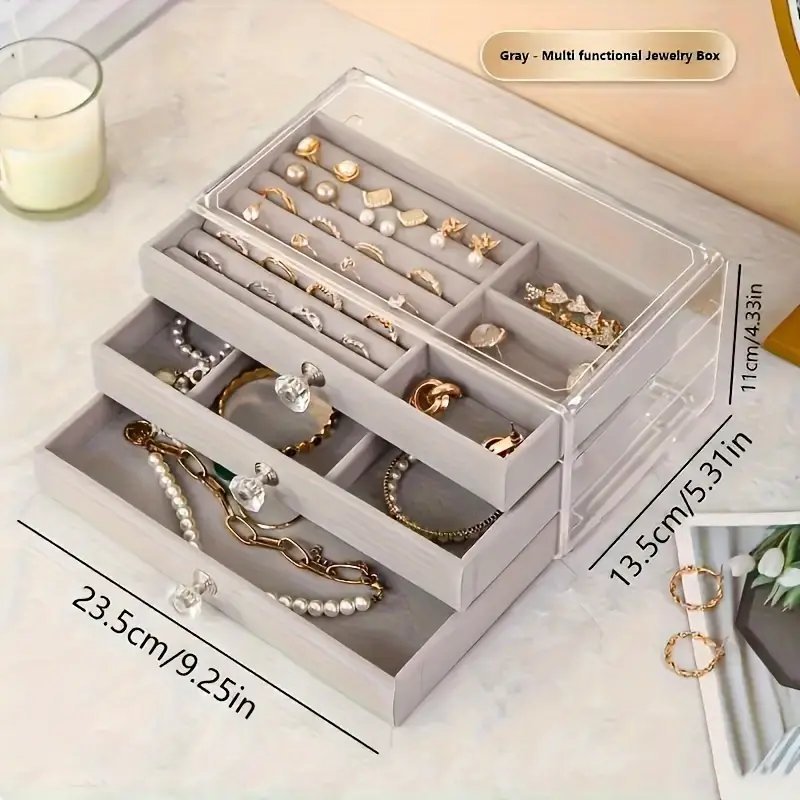 قطعة صندوق تخزين مجوهرات شفاف مخملي ثلاثي الطبقات، صندوق مجوهرات متعدد الوظائف بدرج ثلاثي الطبقات مناسب للأقراط والقلائد اللون الرمادي