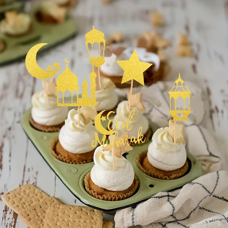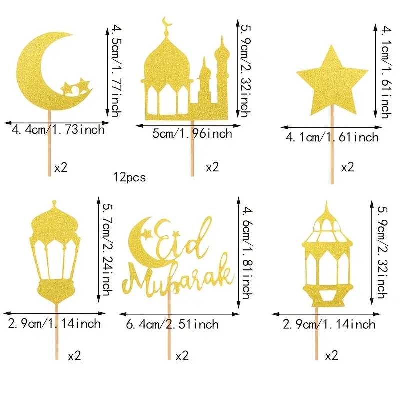 12 قطعة من أعواد الكب كيك رمضان، مزينة بنمط إسلامي لرمضان ، لا حاجة للطاقة