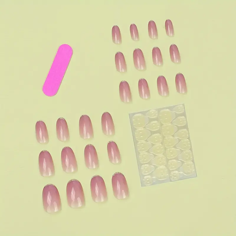 24 قطعة من الأظافر الزائفة البيضاوية المتوسطة اللمعان ، أظافر وهمية بتدرج اللون الوردي العاري مع تصميم طرف فرنسي مزين باللمعان ، أظافر زائفة بأسلوب بسيط للنساء والفتيات للارتداء اليومي والحفلات