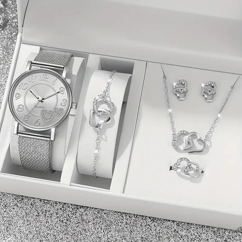6 قطع من ساعات الكوارتز الأنيقة هيكل دائري من سبيكة، + مجموعة مجوهرات بثيمة الحب تتضمن قلادة، خاتم، أقراط وسوار
